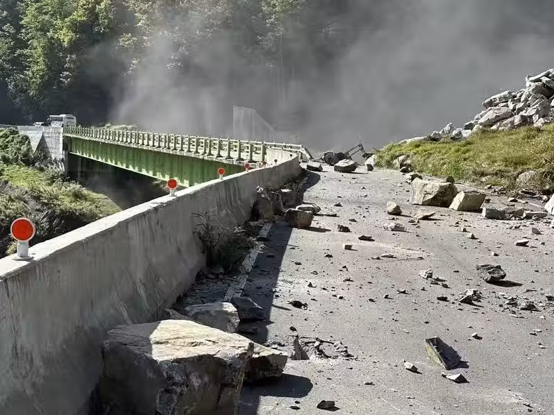 中部橫貫公路便道不敵地震搖晃,沿線滾落巨大落石,無法通行。(圖/公路局谷關工務段提供)