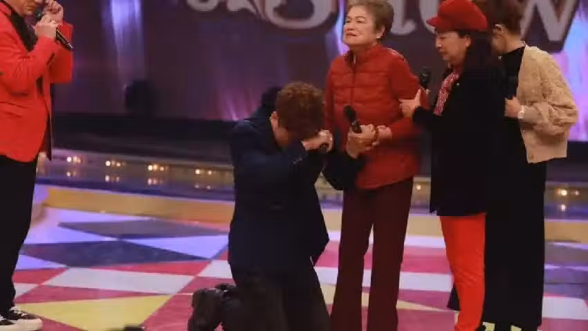回憶起這段往事,楊哲當場跪地向母親致謝,母子相擁而泣的畫面,讓現場所有人為之動容,主持人白冰冰也在一旁攙扶楊母。