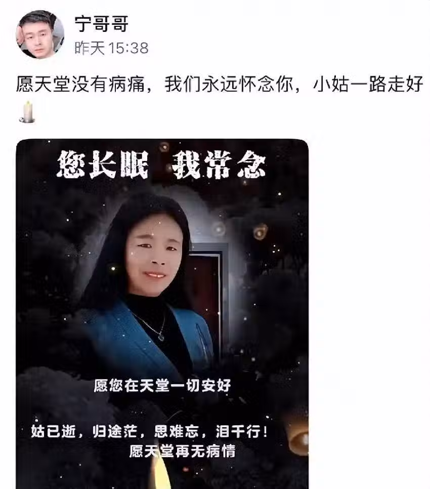 3月25日,網紅「寧哥哥」含淚發布一條動態,沉痛哀悼自己的姑姑,在配備的文案中,「寧哥哥」寫道:「姑已逝,歸途忙,思難忘,淚千行」,足以看出姑侄之間感情之深厚。