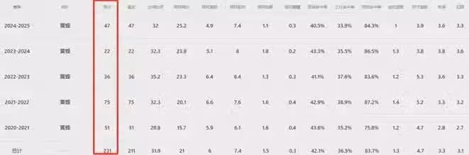 出道五個賽季里,三球總共就打了231場常規賽,平均每個賽季出戰46場,至於季後賽嘛,還沒有打過一場。