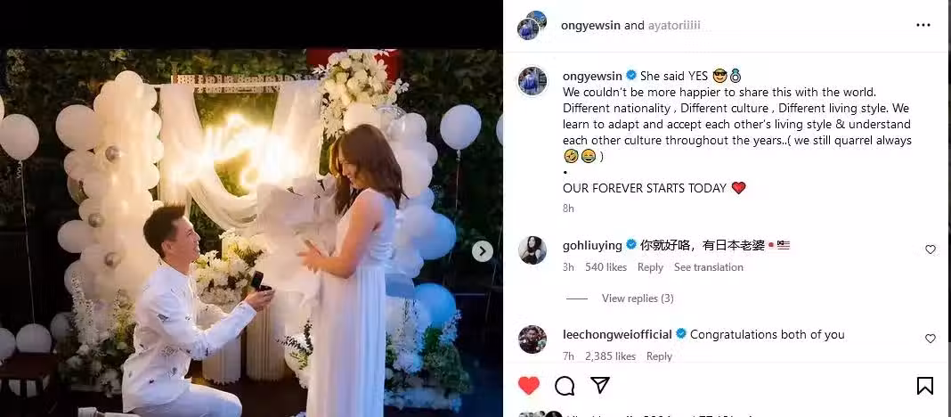 王耀新向日本女單美女大堀彩求婚成功後,一眾羽壇球星包括李宗偉等紛紛在他宣布喜訊的IG帖文下留言送上祝福。
