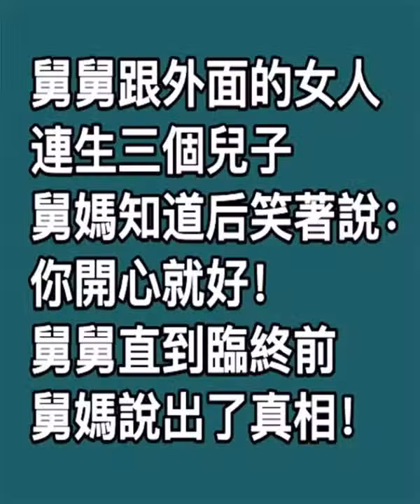 舅舅跟外面的女人連生三個兒子,舅媽知道後笑著說:你開心就好!舅舅直到臨終前,舅媽說出了真相........