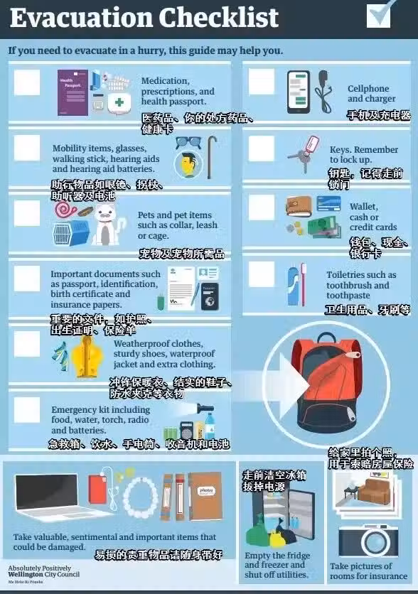 記住疏散之前,如果時間准許的話,家裡的門一定要鎖,所有的汽車機械鎖進車庫,蓋上帆布,使其免受火山灰。 家裡比較貴重的電子物品也要用布罩上,等到整個地方完全沒有火山灰落下的時候再揭開。 疏散前可以關心一下附近的朋友或鄰居,看看有無人需要緊急援助。