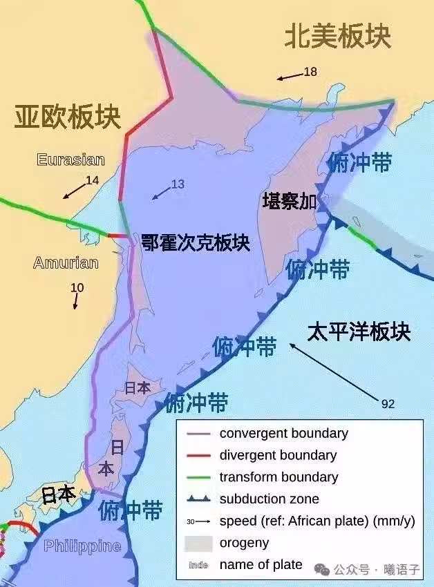 📌 鄂霍次克板塊像一把劍直衝日本島,太平洋板塊還在繼續向東運動堪察加- 千島群島-日本中部能量還沒釋放完,鄂霍次克板塊的南端直插日本。 ESRI/ArcGIS資料庫