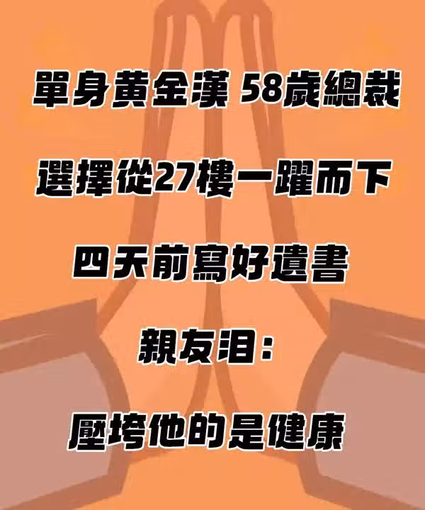 單身黃金漢!58歲總裁「選擇從27樓一躍而下」震撼圈內 「4天前寫好遺書」親友淚:壓垮他的是健康