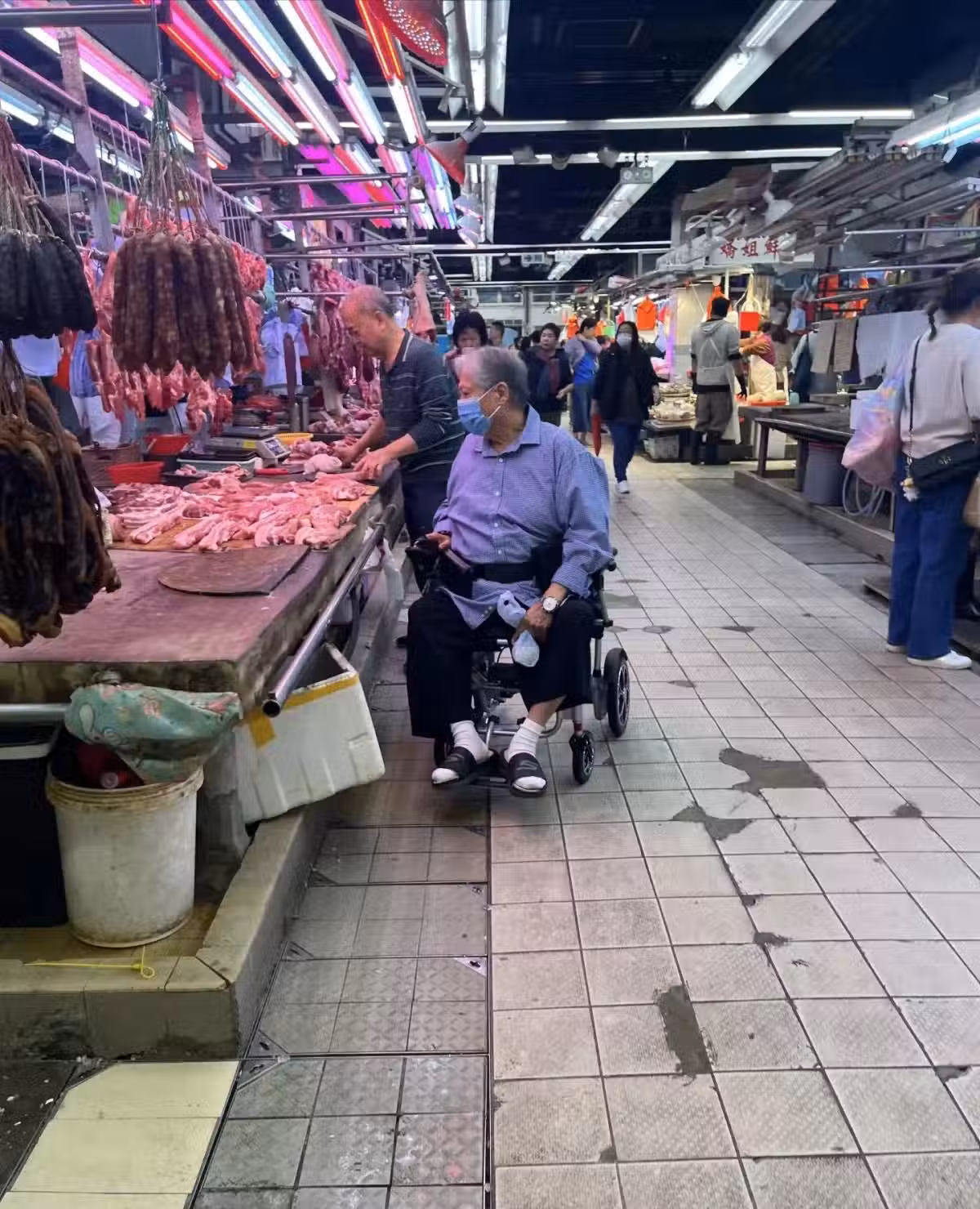 75歲洪金寶在香港,坐輪椅去菜市場,買了一塊豬肉,全程親力親為