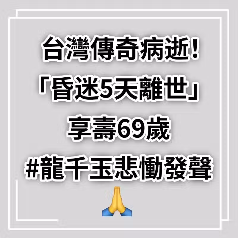 台灣傳奇病逝!驚傳「昏迷5天離世」享壽69歲 #龍千玉悲慟發聲........