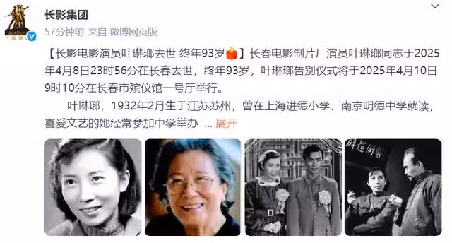 4月9日,演藝圈傳來噩耗,長影集團對外發布了一則訃告,悲痛公告表演藝術家葉琳琅於2025年4月8日23時56分在長春去世,享年93歲,其告別儀式將於4月10日9時10分在長春市殯儀館一號廳舉行!