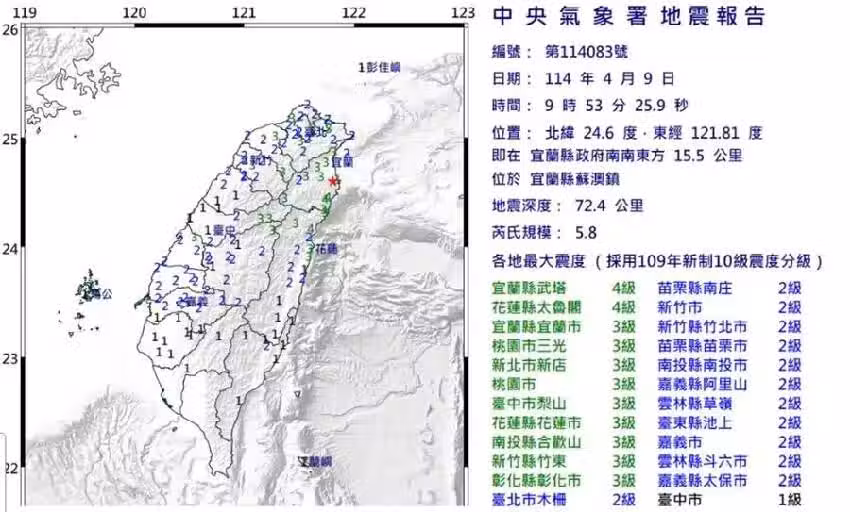 針對9日上午9時53分左右的宜蘭5.8地震,郭鎧紋指出,這起地震為菲律賓海板塊隱沒到歐亞大陸板塊,能量釋放相當於0.25顆原子彈,屬於正常能量釋放。