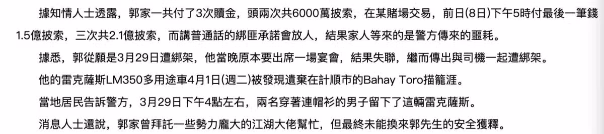 68歲菲律賓鋼鐵大王遭撕票,家人三度交贖金2680萬,祖籍福建永春