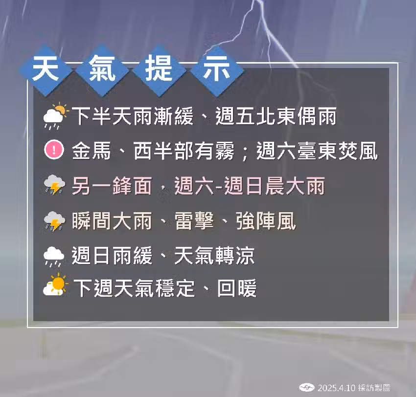周日上午北部地區將逐漸放晴,中南部及東部地區雖仍有短暫降雨,但強度會減弱。