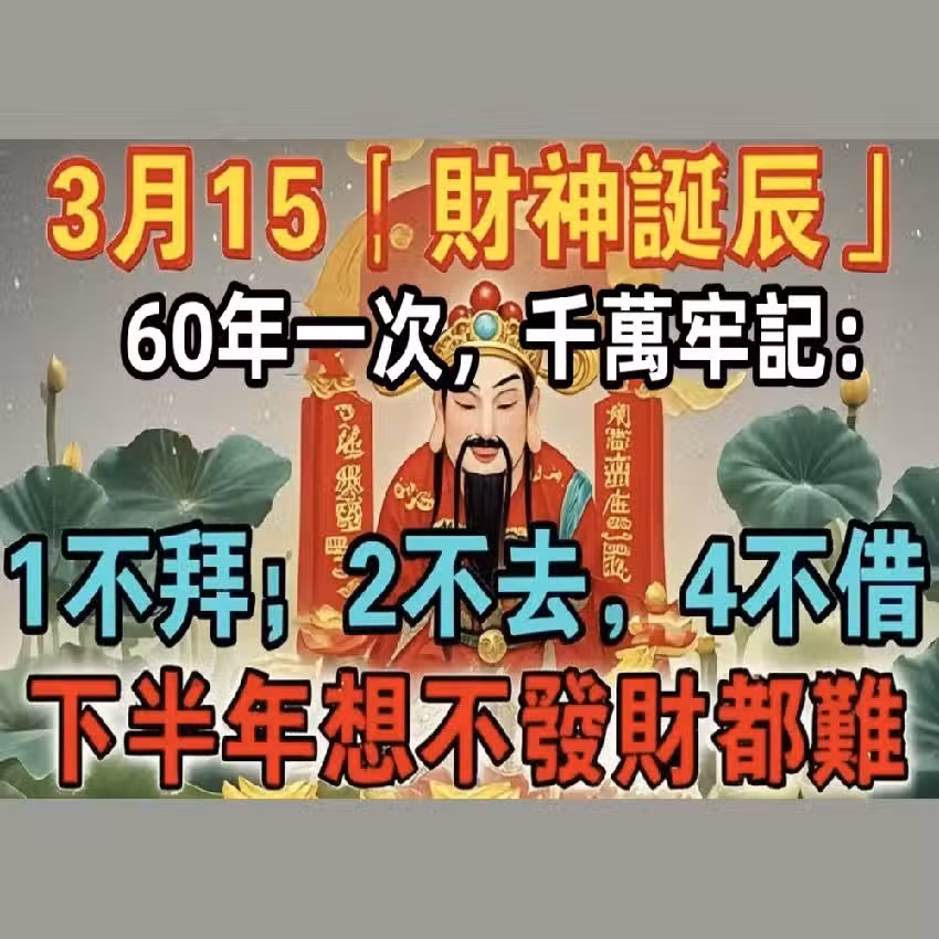 就在今天!農曆3月15「財神誕辰」,起床後牢記:1不拜,2不去,3不吃,4不借!納財迎福!