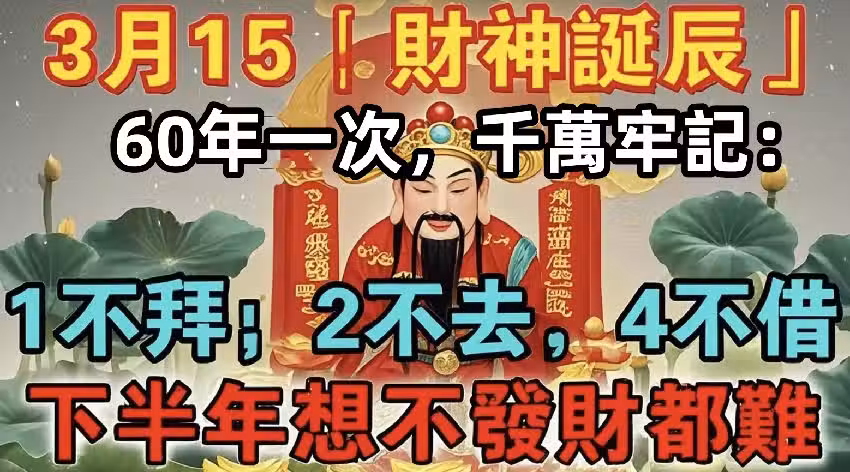 就在今天!農曆3月15「財神誕辰」,起床後牢記:1不拜,2不去,3不吃,4不借!納財迎福!