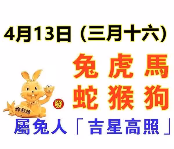 屬兔人吉星高照,小人不敢靠近,貴人齊湧現的一天,而且積極性提高,靈感不斷,有著獨到的自我見解,讓身邊人刮目相看。 交際運活絡,適合組織聚會活動,是拓展人際關係的絕佳時期,好運可持續不斷。