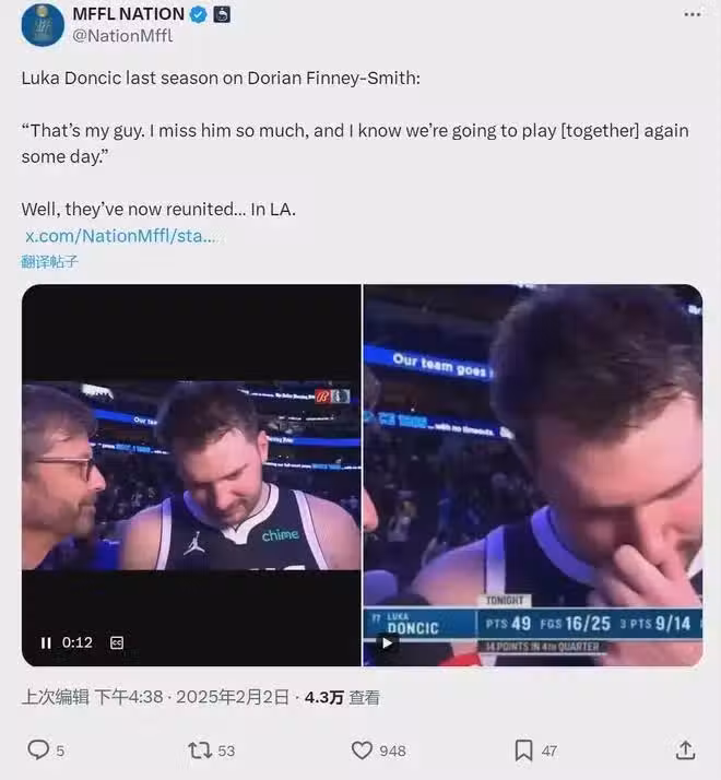 這件事東契奇以前也干過,2023年2月,芬尼-史密斯被獨行俠送至籃網。此後獨行俠跟籃網交手,東契奇接受採訪時公開說道:「我非常想念他,而且我知道我們將來有一天還會並肩作戰。」本賽季東契奇和芬尼-史密斯在湖人重聚了!
