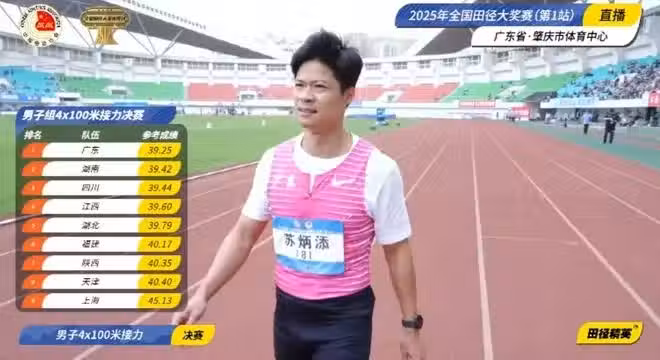 就在昨天,蘇炳添棄權了全國田徑大獎賽的100米半決賽,這也是他個人百米短跑的謝幕戰,棄權則是為了更好的衝擊4*100米接力項目。而在今天,蘇炳添再次圓夢。在全國田徑大獎賽的4*100米決賽上,蘇炳添率領廣東隊成功奪冠。他在第一棒起跑,展現出了強大的實力,最終廣東隊成功登頂,這場團隊勝利也為蘇炳添的職業生涯添上了濃墨重彩的一筆。