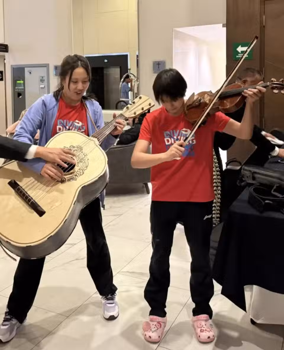 最有意思的還是這張照片:全紅嬋拉小提琴,陳若琳彈吉他,當然只是擺拍。指導老師還要求嬋寶:「收肚子,挺直背。」樣子非常可愛。