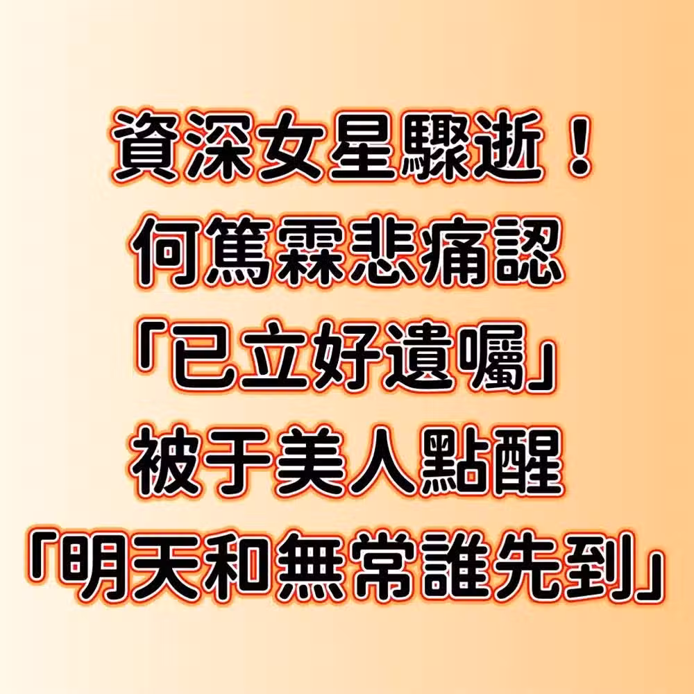 資深女星驟逝! 何篤霖悲痛認「已立好遺囑」 被于美人點醒「明天和無常誰先到」