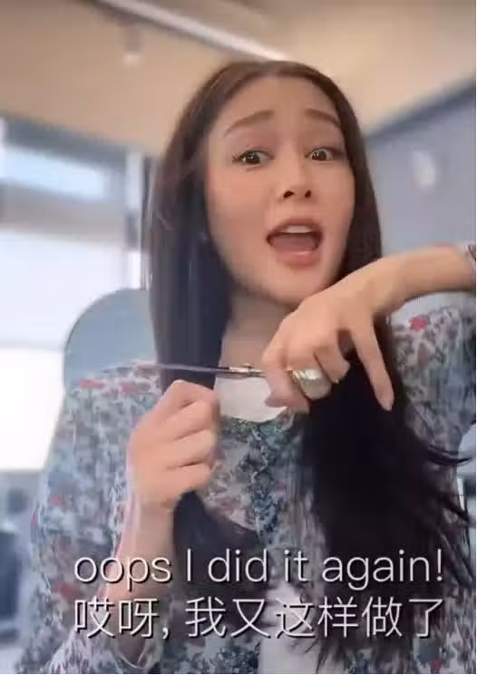 近日岑麗香在她的社交平台上,上傳了一段搞笑的視頻。只見視頻中的岑麗香一改往日甜美形象,嘴裡一邊說著英文,一邊誇張的做著表情,手裡還拿著把剪子準備剪掉她的長髮。