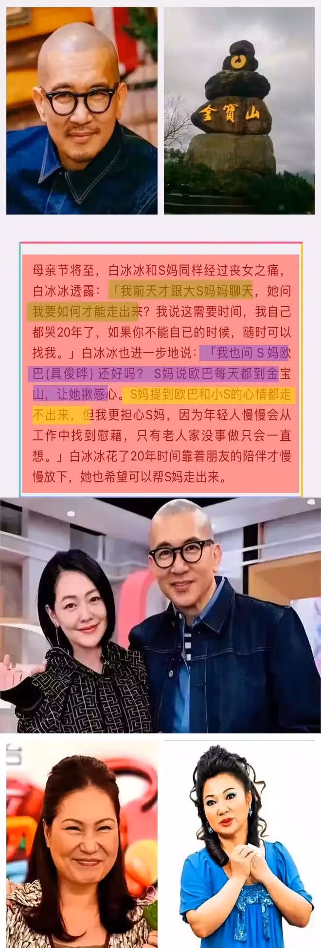 都是白髮人送黑髮,真讓人唏噓。白冰冰說最近見了黃春梅,黃春梅還問起她是怎麼走出喪女之痛的。白冰冰又關心地問黃春梅具俊曄的情況,黃春梅表示他每天都去金寶山看大S,實在讓她很擔心。黃春梅還提到,雖然大S去世已經兩個多月了,小S和具俊曄還是難以走出來。看來黃春梅的狀態似乎要比小S和具俊曄要好一點。