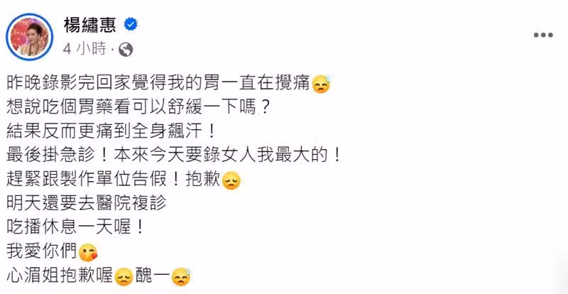楊繡惠無奈地說,身體這樣只好趕快跟製作單位告假,對於影響他們錄影感到非常抱歉,而且隔天還要繼續到醫院複診觀察狀況。粉絲看到後,紛紛留言關心:「姊要多注意自己的身體!」、「小狀況就要注意,不能等到有大病才處理!」、「祝你早日恢復健康!」