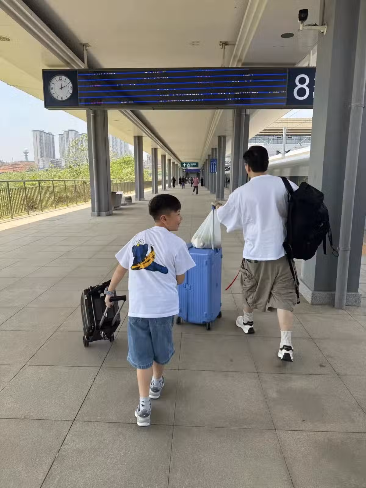在前往高鐵站時,蘇永康和8歲的兒子一起拖著行李箱。父子兩人的打扮都很清爽,穿著白色短袖T恤搭配短褲,因為趕高鐵,即使穿這麼單薄,依然被熱得滿頭大汗!