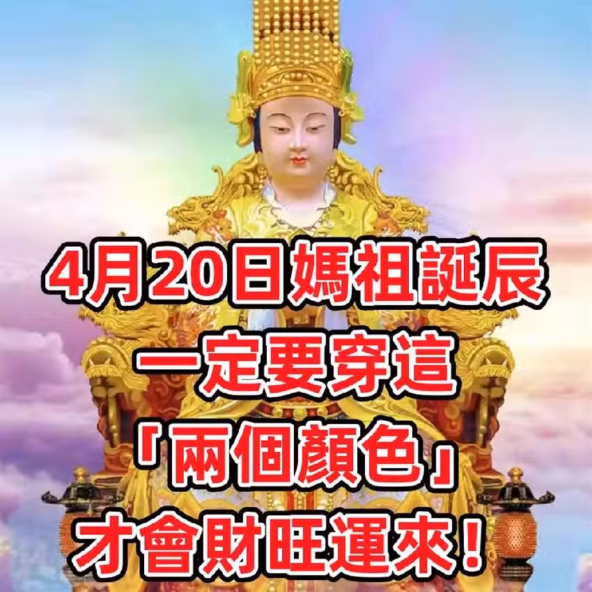 💰 一定要穿這「兩個顏色」才會財旺運來! 一年一度的「天上聖母媽祖誕辰」即將在**2025年4月20日(農曆三月廿三)**舉行!這一天是民間信仰中最靈驗、最具庇佑力量的好日子,若你能在這天穿對顏色、行善祈福,整年的好運、財運都會被媽祖娘娘開啟! 而風水師與命理老師一致指出:在媽祖誕辰這天穿「紅色」與「金色」最旺財轉運!