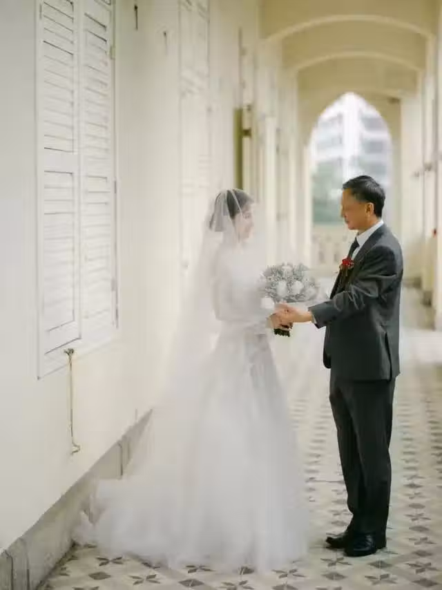 婚禮現場看到新娘穿上高貴婚紗,蹺著父親步入教堂,場面十分溫馨感人。而當鄧爸爸把女兒交給郭子豪時,盡現不舍之情,還向一旁的郭子豪贈予囑咐,鄧卓殷在旁眼泛淚光。