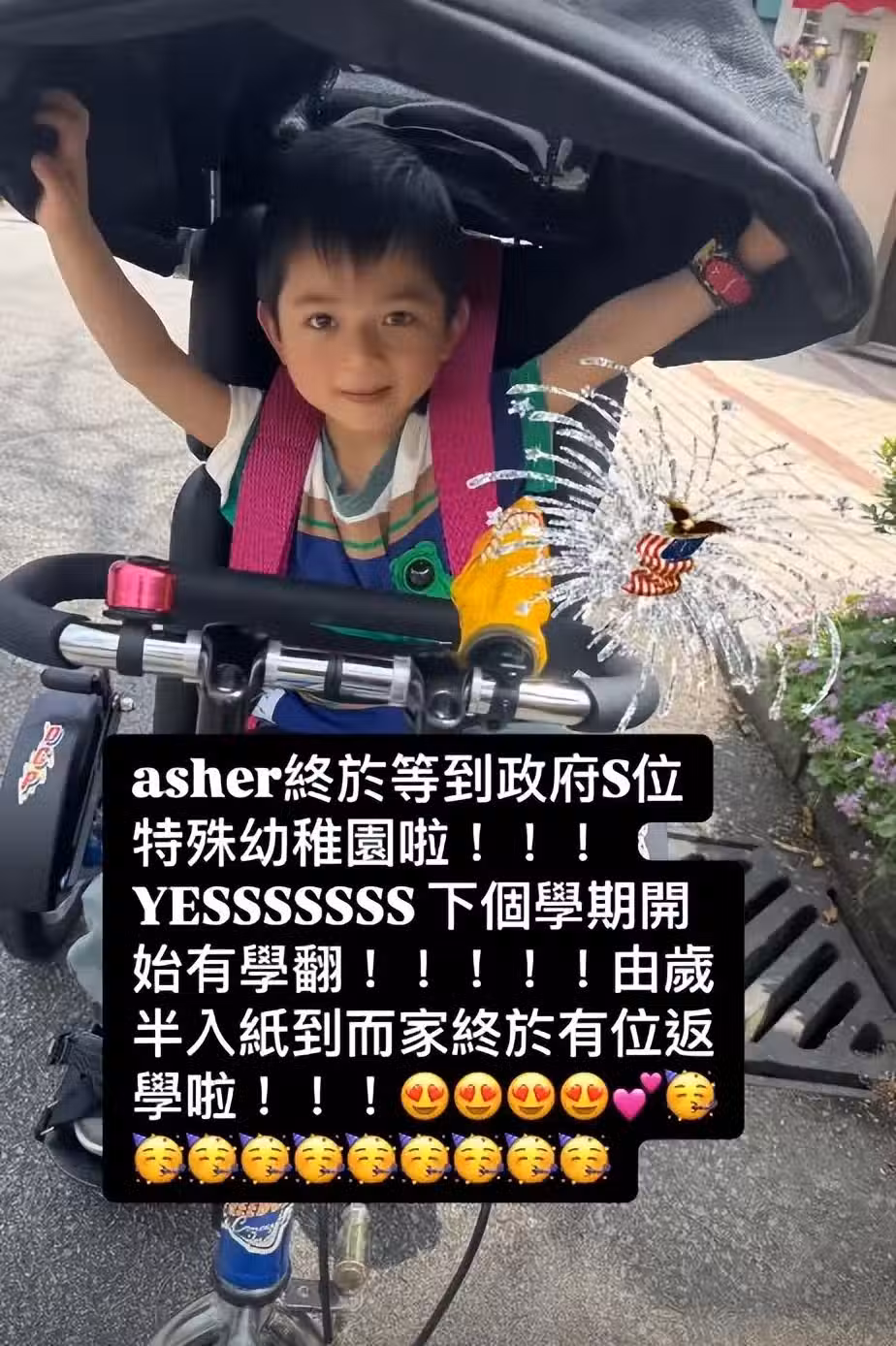 (22日)何雁詩貼上兒子的相片宣布喜訊:「Asher終於等到港府S位特殊幼稚園啦!YESSSSS下學期開始上學!從一歲半入紙到現在終於有位置上學啦!」