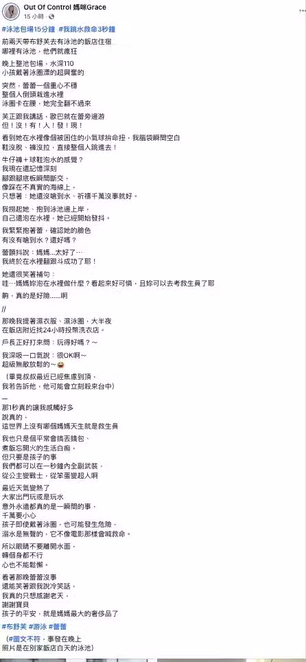 這場驚魂記後,Grace不敢將意外告訴正在台北的丈夫阿翔,「畢竟叔叔最近已經焦慮到頂,我若告訴他,他可能會立刻殺來台中」。