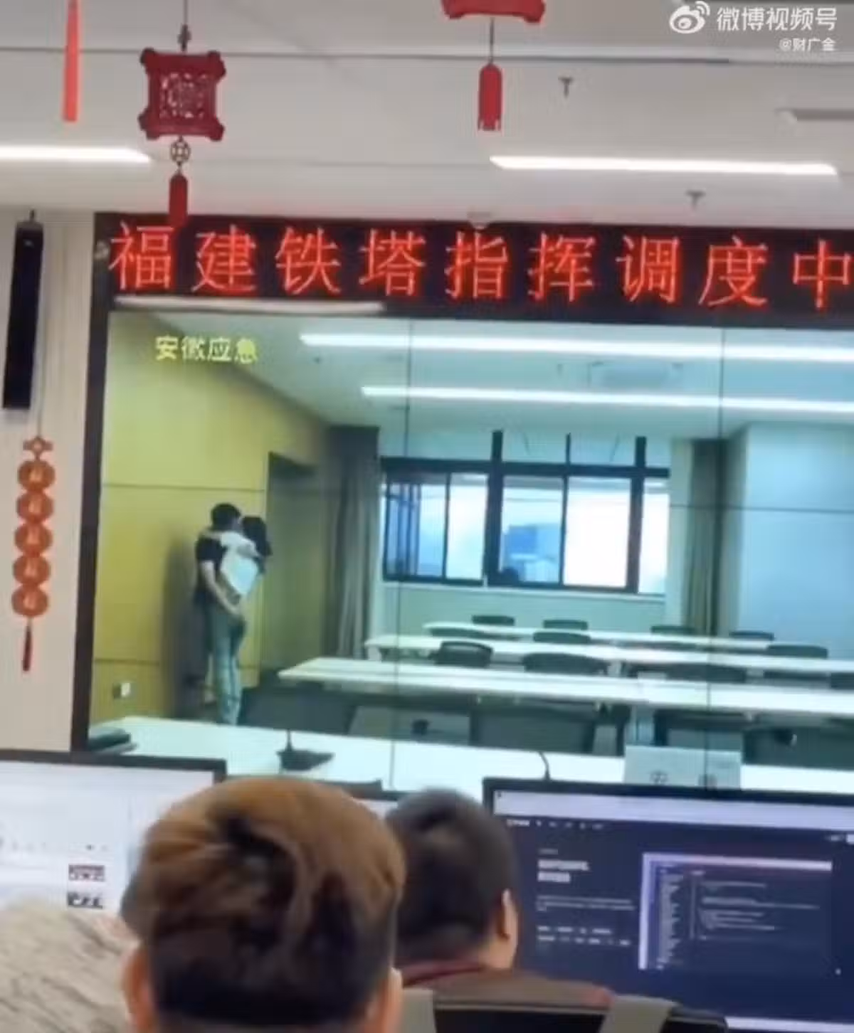 根據流傳影片內容顯示,這對男女在安徽鐵塔的會議室內熱情激吻,男方甚至將手放在女方的臀部上來回搓揉,短短11秒的影片在網絡上流傳。更尷尬的是,男女似乎以為兩人在辦公室的激情無人知曉,孰料,螢幕的另一端、就在福建的鐵塔總控中心裡,一群工作人員正「直播觀看」,更不時交頭接耳討論。