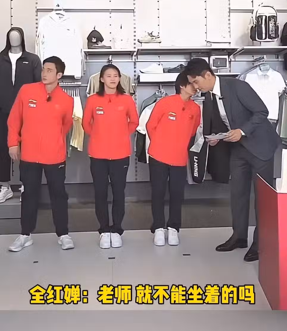 主持人請求過後,工作人員搬來了3張椅子,三位奧運冠軍終於坐下了。活動繼續進行,主持人拿著一條褲子,曹緣摸著面料體會手感。這位主持人忙前忙後,臉上出了不少汗水。全紅嬋悄悄地找出了一張紙巾,在主持人說話的間隙,將紙巾遞了過去:「擦擦汗吧,老師,給。」主持人接過紙巾後,連忙表示:「謝謝全妹,謝謝全妹!」