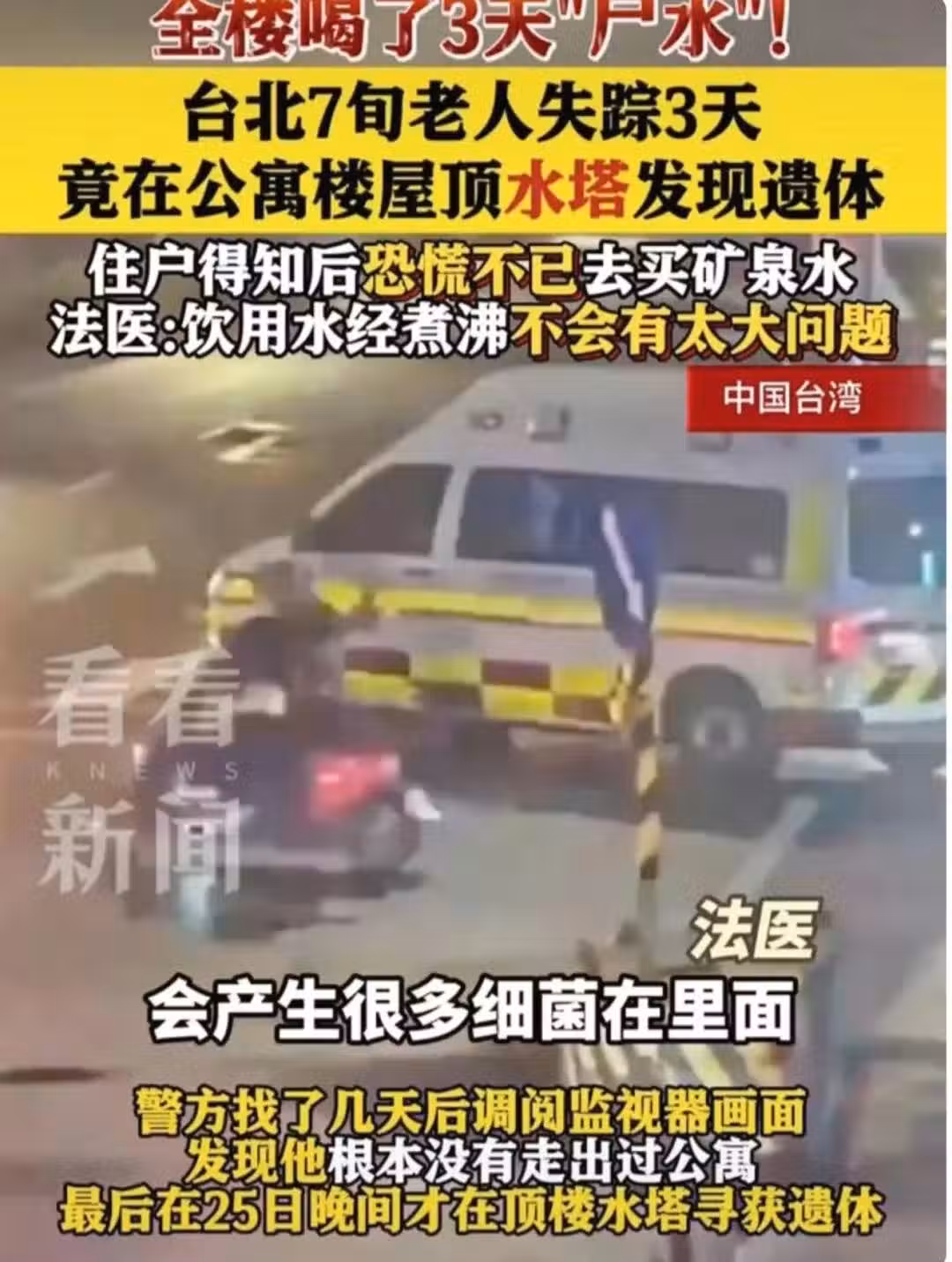 可更讓人頭皮發麻的是,從4月24號開始,整棟樓的十餘戶居民就察覺到水壓變小,水還有股怪味,可大家都以為是臨時故障,沒當回事兒。直到25號,水變得渾濁刺鼻,這才發現了水塔里的秘密。也就是說,這三天裡,大家喝水、做飯、洗澡,用的全都是泡著黃大爺遺體的「屍水」!
