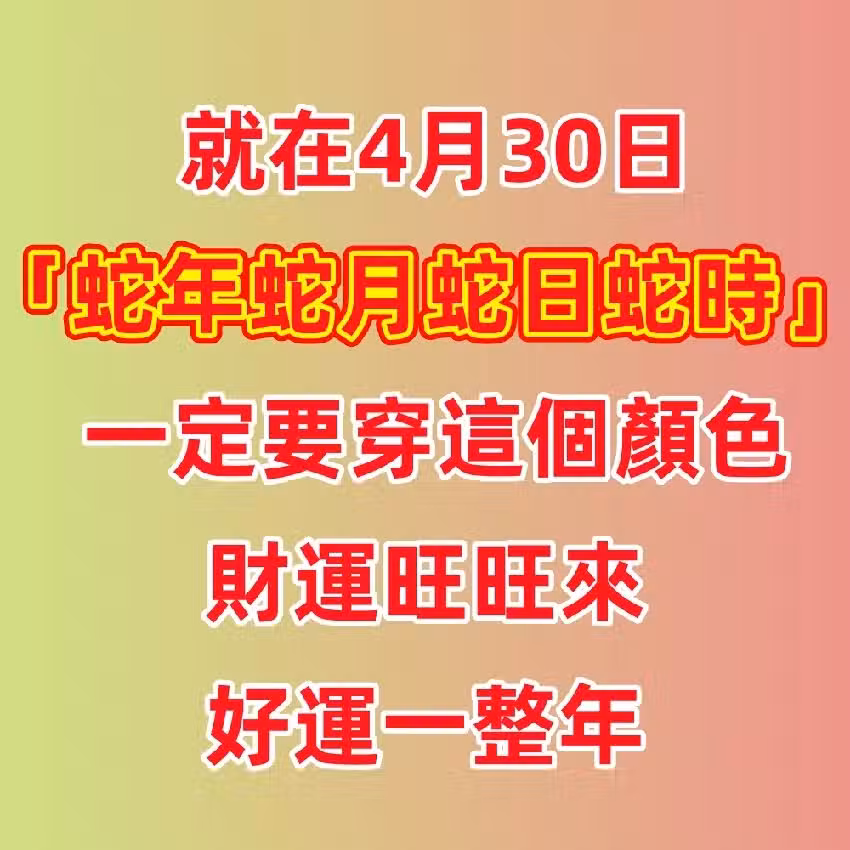 就在4月30日「蛇年蛇月蛇日蛇時」 一定要穿這個顏色,財運旺旺來 好運一整年!