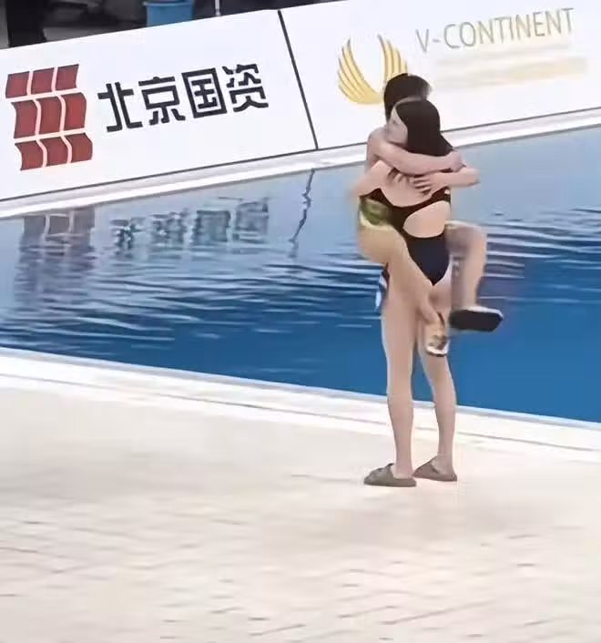 跳水運動員齊聚水立方,英國好閨蜜熊抱全紅嬋,兩人笑的燦爛