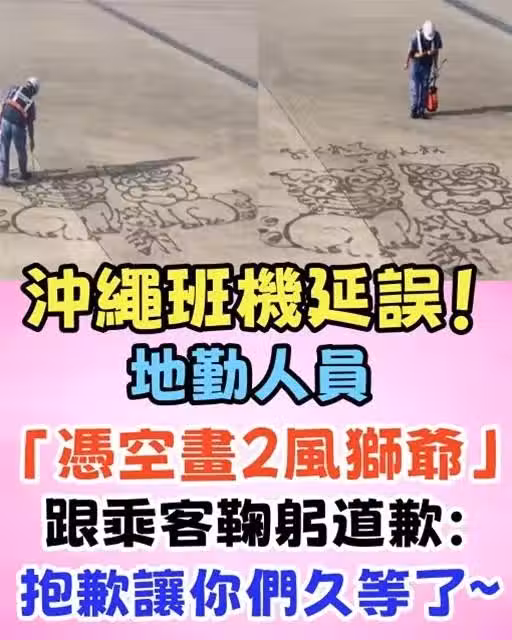 近日,在日本沖繩縣的那霸機場,一班航班因不明原因延誤起飛,讓許多乘客必須在機場等待更長的時間。在這段等待期間,一名地勤人員利用高壓水管在機場地板上畫出了兩隻風獅爺,並寫上「抱歉遲到了」等詞語。這位地勤人員還向機上乘客鞠躬致意,讓人感受到他的貼心與誠意。 v