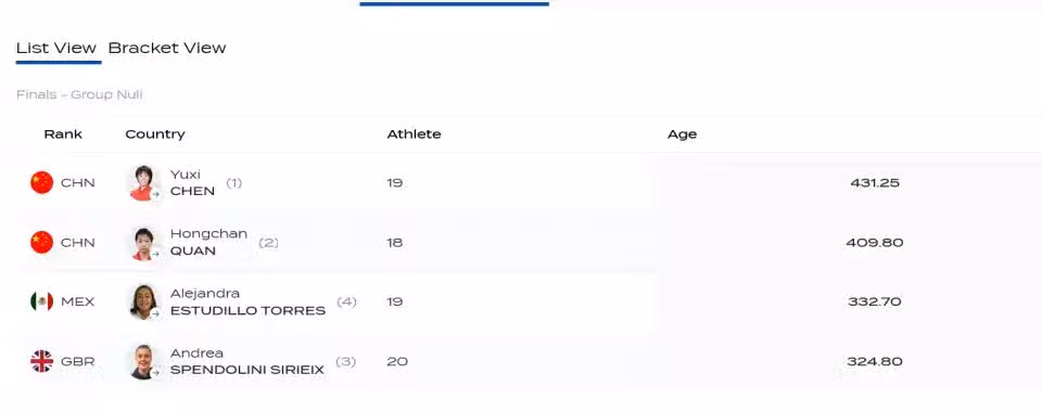 此外,墨西哥選手亞歷杭德拉獲得銅牌,英國選手斯彭多利尼排名第四無緣領獎台。