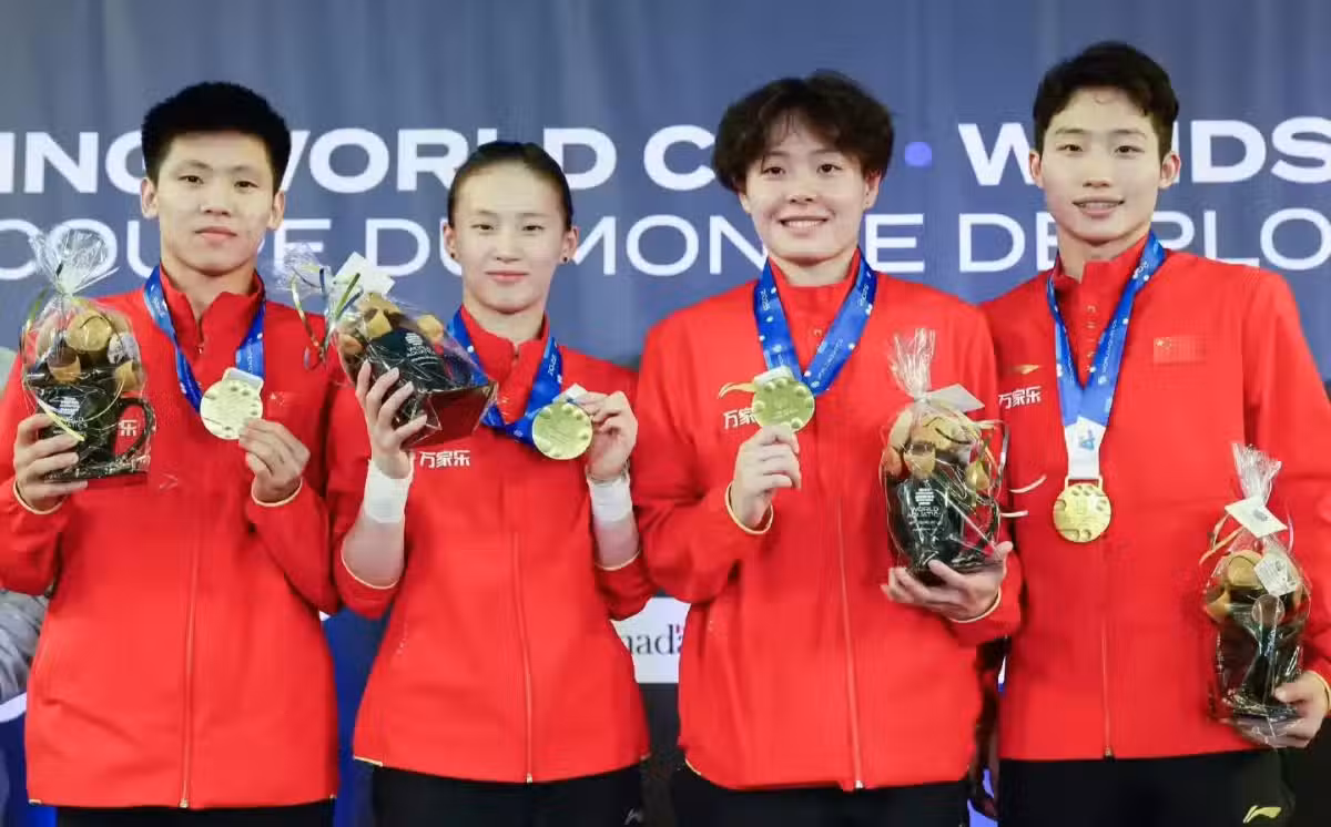 在雙人10米台決賽中,陳芋汐與全紅嬋默契配合,以350.88分奪冠,領先第二名近50分,第四跳407C和第五跳5253B的驚艷表現,如同「複製粘貼」般同步。混合團體賽上,她與隊友攜手,為中國隊包攬首日5枚金牌立下汗馬功勞。