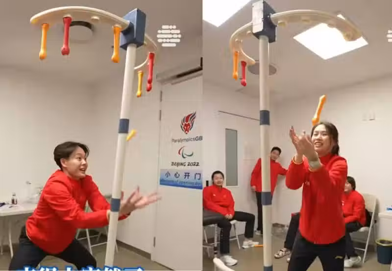 面前擺放的是一個高高的架子,架子裡有8個類似於骨頭一樣的棒子,棒子隨機掉落,看運動員們的反應能力,在規定的時間內能接住幾個。
