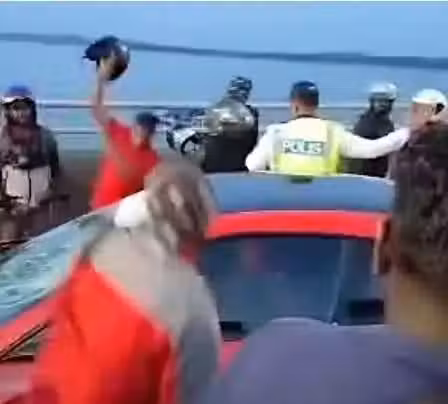 路過的麻坡騎士用頭盔怒砸肇禍轎車。