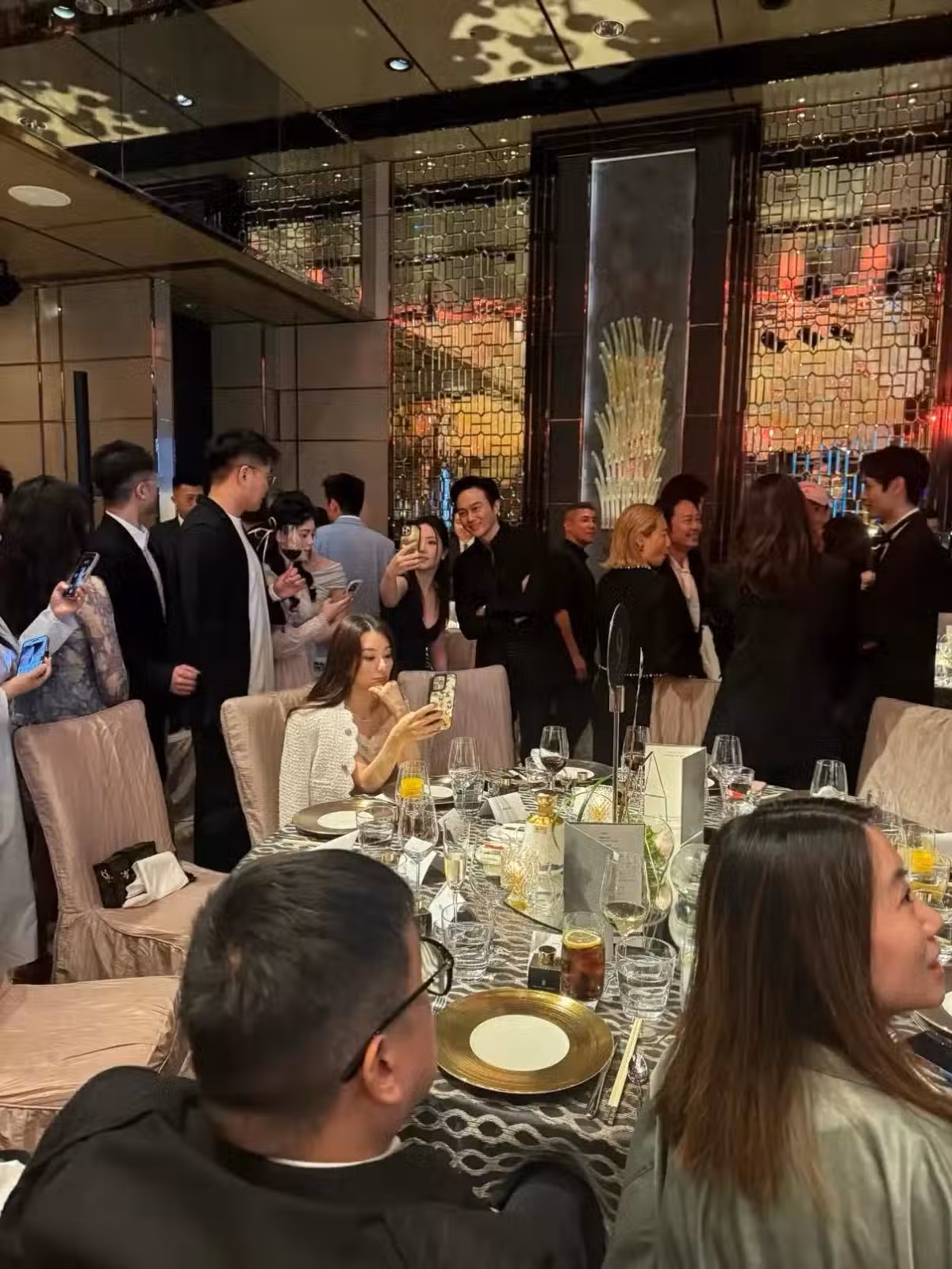 但因為方媛不是娛樂圈人士,在現場認識的人不多,就顯得有點落寞,獨自一人坐在那裡玩手機,而且同桌的人基本都已經離開去應酬了,方媛左右幾個位置都是空的。有趣的是,方媛還意外跟身後正在合影的張智霖同框了。