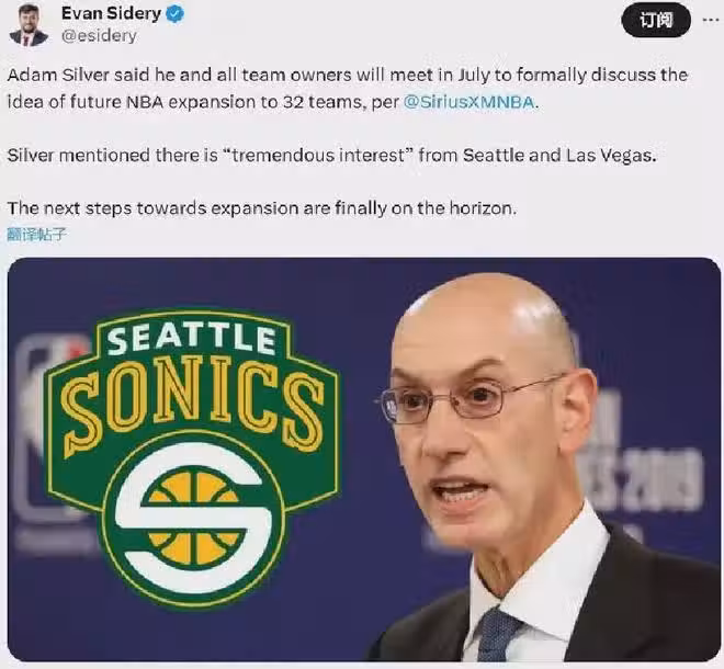NBA總裁肖華宣布,今夏將與各隊老闆討論聯盟擴軍的問題,計劃增加至32支球隊。