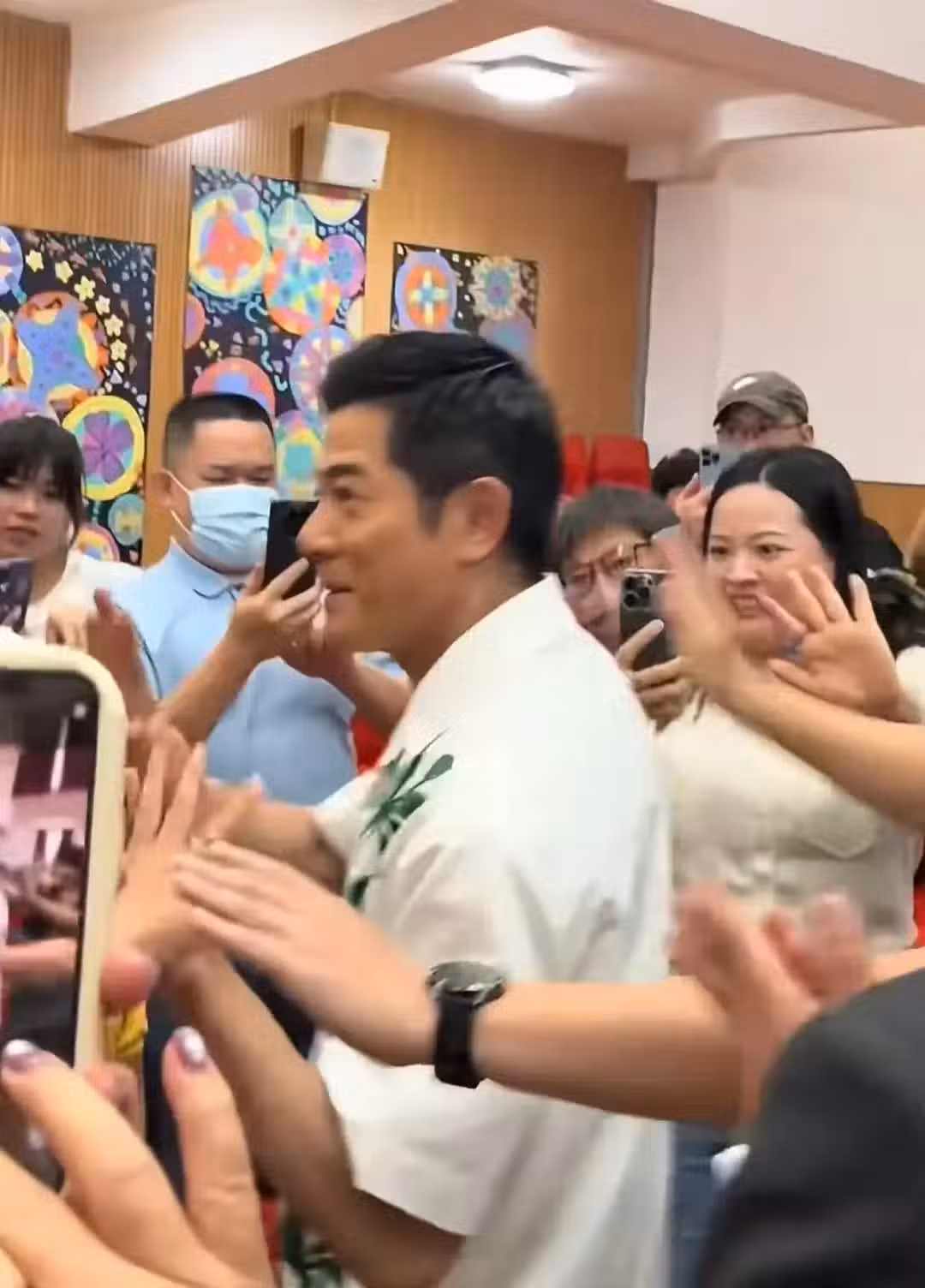 當時大堂里還有學生家長在場,家長們一看到郭富城出現,立刻兩眼放光,連孩子都不顧了,迅速跑過去圍堵郭富城,拿起手機拍照,場面一度有些失控!
