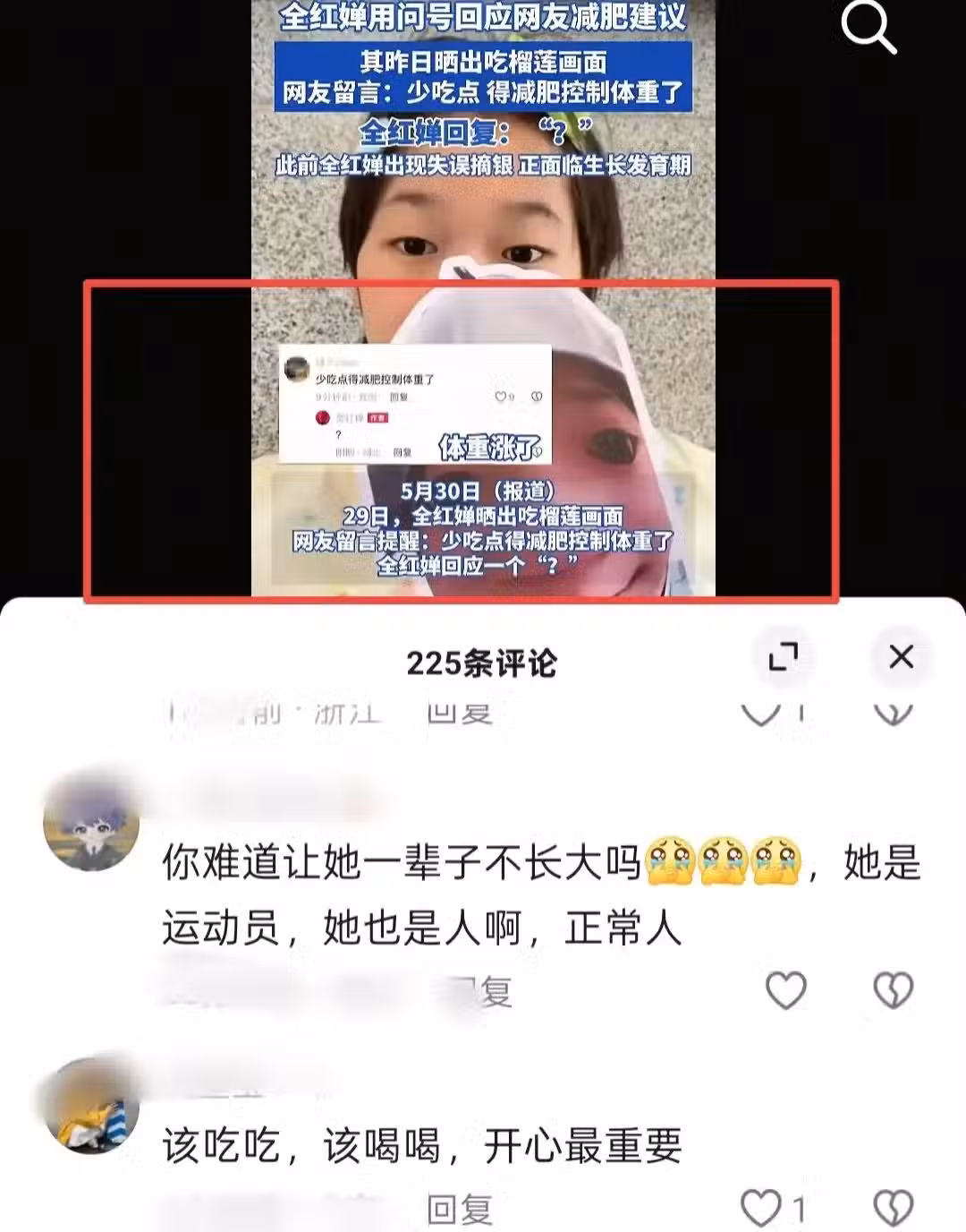 全紅嬋退賽後首更動態,遭網友喊話少吃點減肥,回應體現高情商