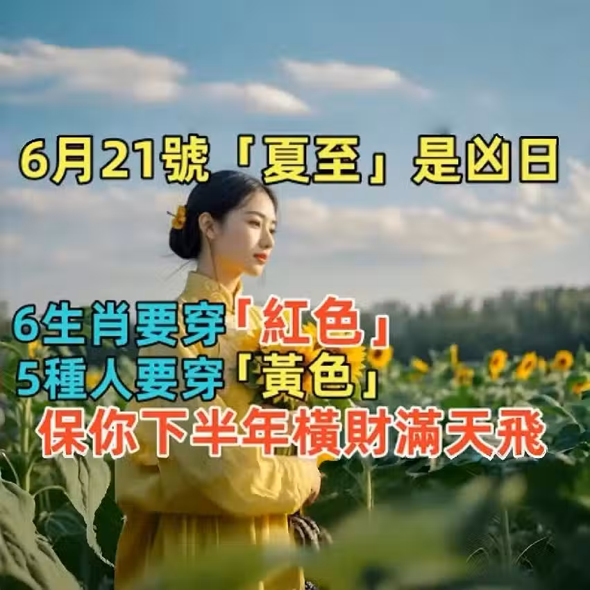 6月21號「夏至」是凶日,6生肖要穿「紅色」,5種人要穿「黃色」,保你下半年橫財滿天飛!