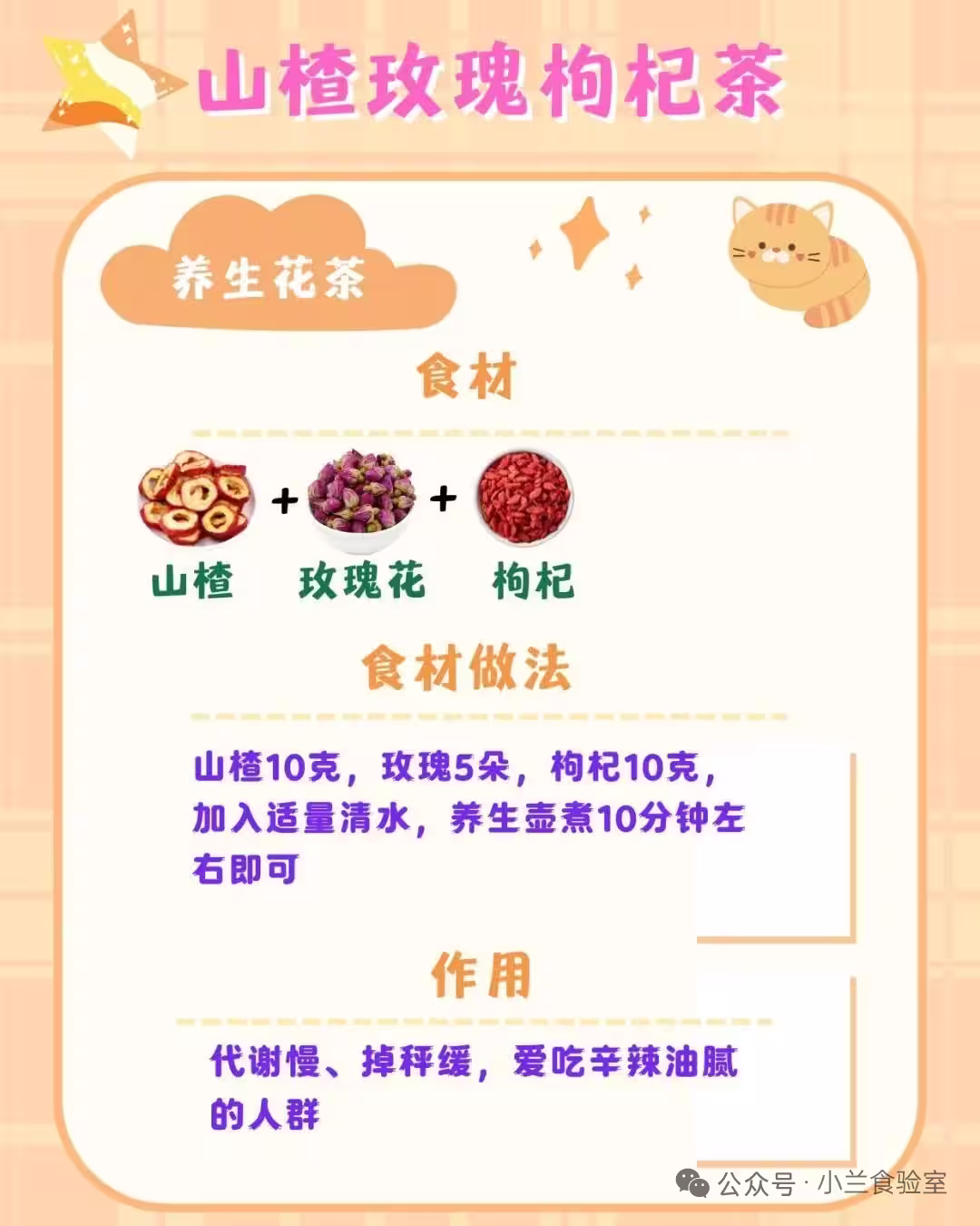 食材:山楂10g+玫瑰花5g+枸杞10g