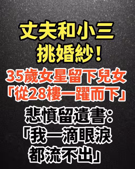 丈夫和小三挑婚紗!35歲女星留下兒女「從28樓一躍而下」 悲憤留遺書:「我一滴眼淚都流不出來」