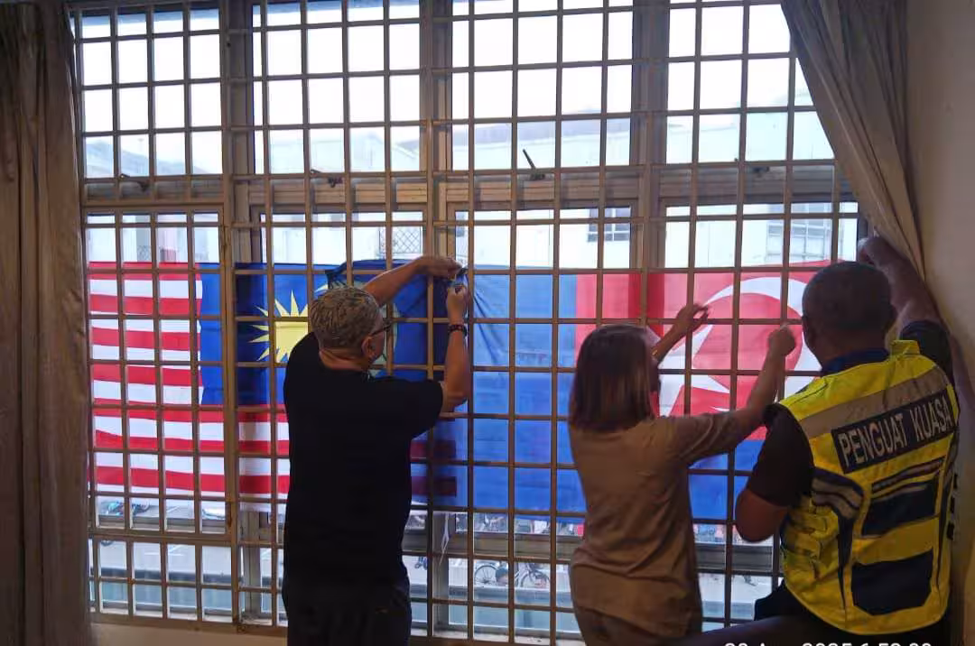 牙科診所職員在警察及市議會執法人員監督下,將國旗與柔佛州旗的位置一併調整至正確懸掛方式。(取自笨珍市議會官方臉書)