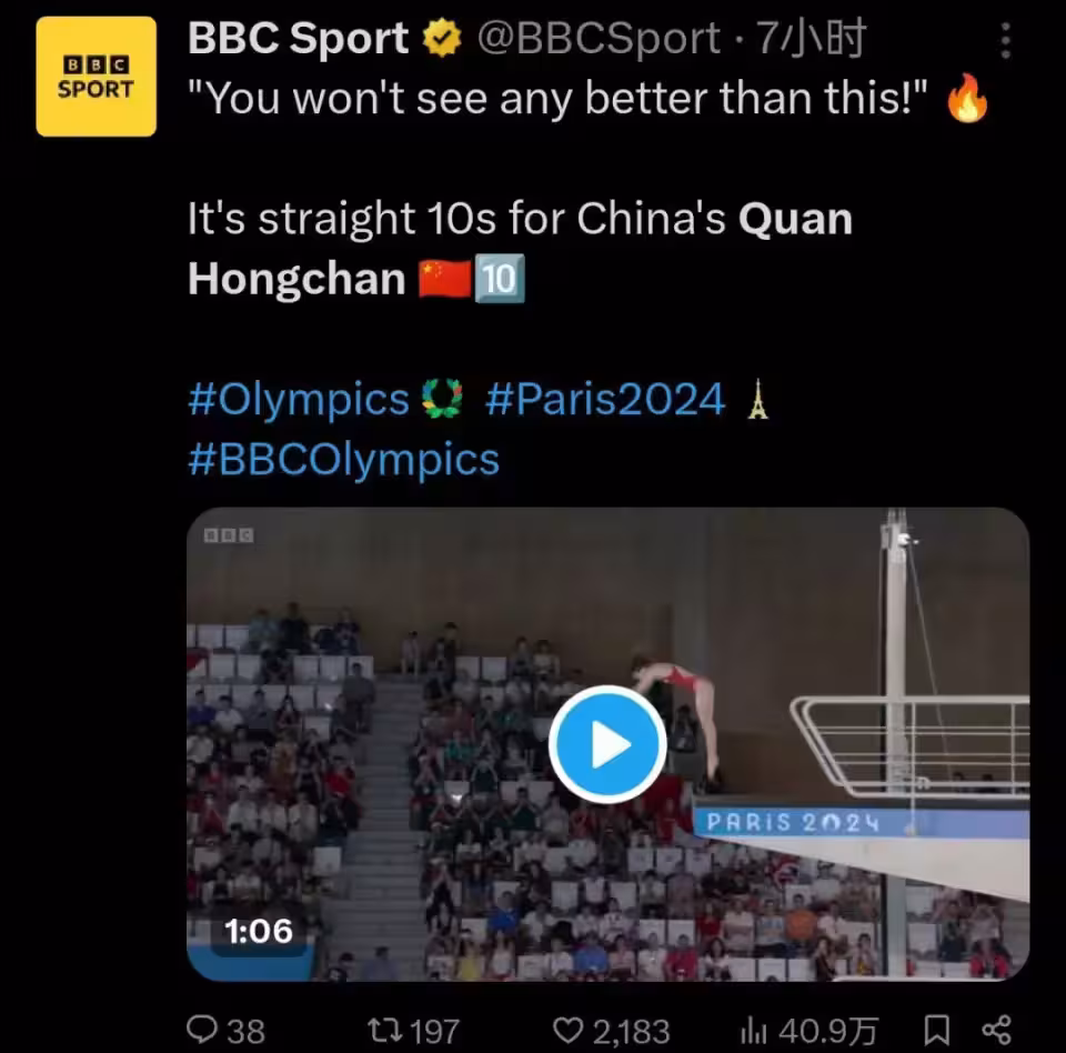 「中國的全紅嬋在周二10米跳台的決賽中,第一跳就充分展示了什麼叫『無水花』。她超強控制水花的能力在國際跳水界掀起了巨浪,教練員和粉絲們敬佩得無以言表。他們因此創造了一個新的說法 ——『水花消失術』。」