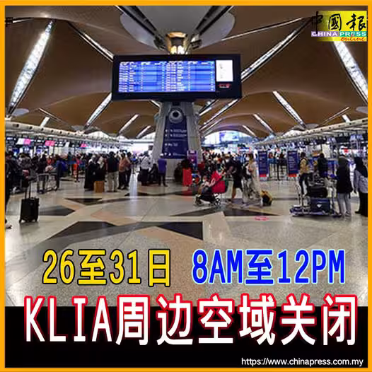 26至31日 8AM至12PM KLIA周邊空域關閉